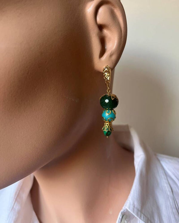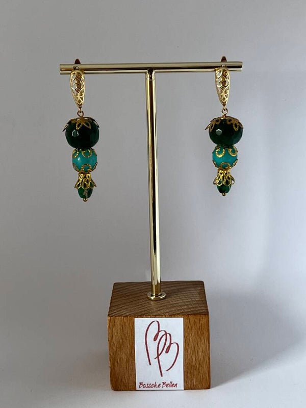 Vergulde filigraan oorsteker met facet kristalglas kralen en jaspis, groen, met gouden accenten