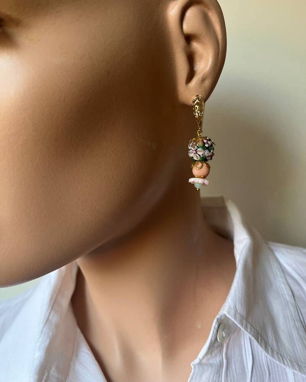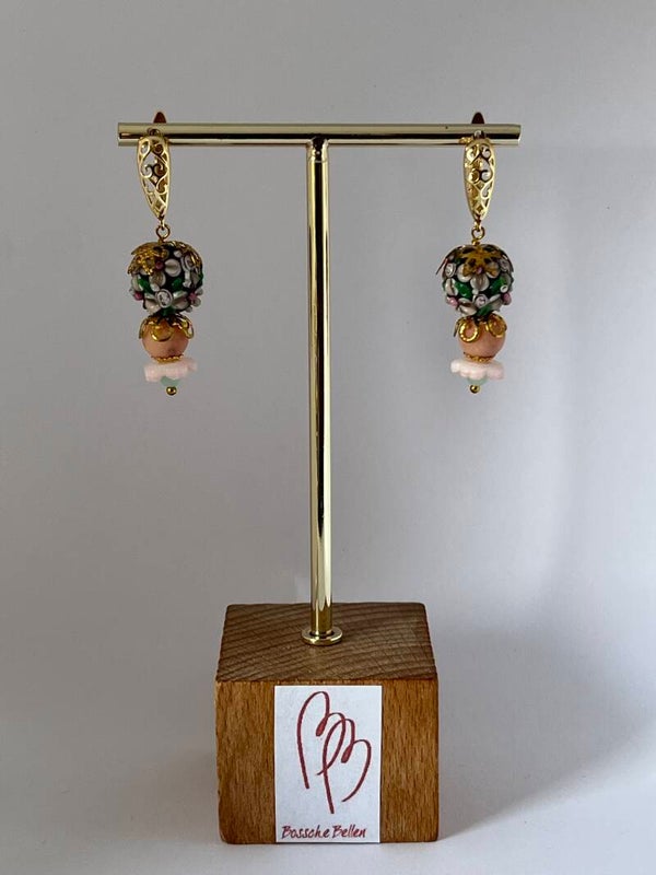 Vergulde filigraan oorsteker met gebloemde lampwork kraal met jaspis en schelp bloemtje, in rozetinten, met gouden accenten