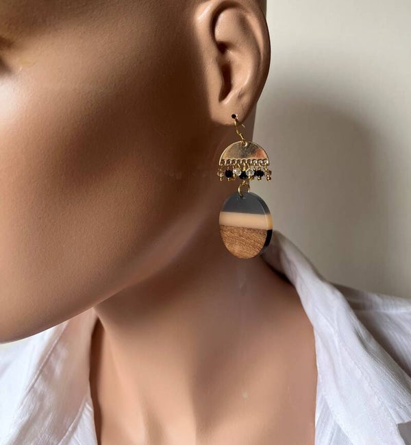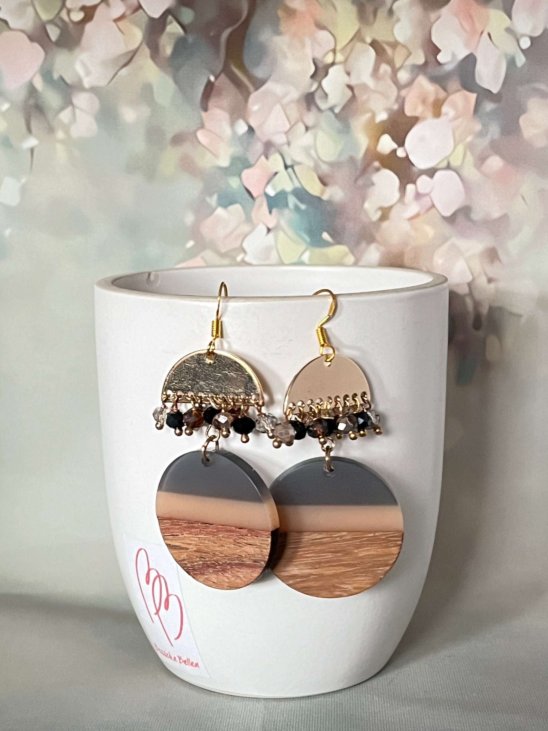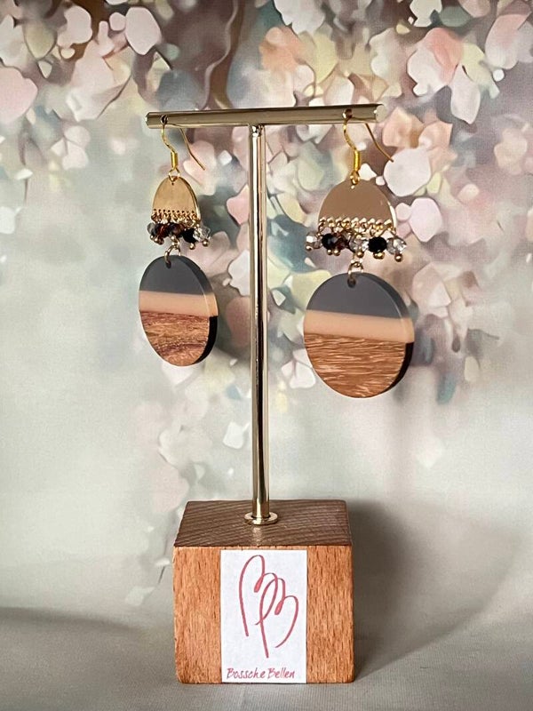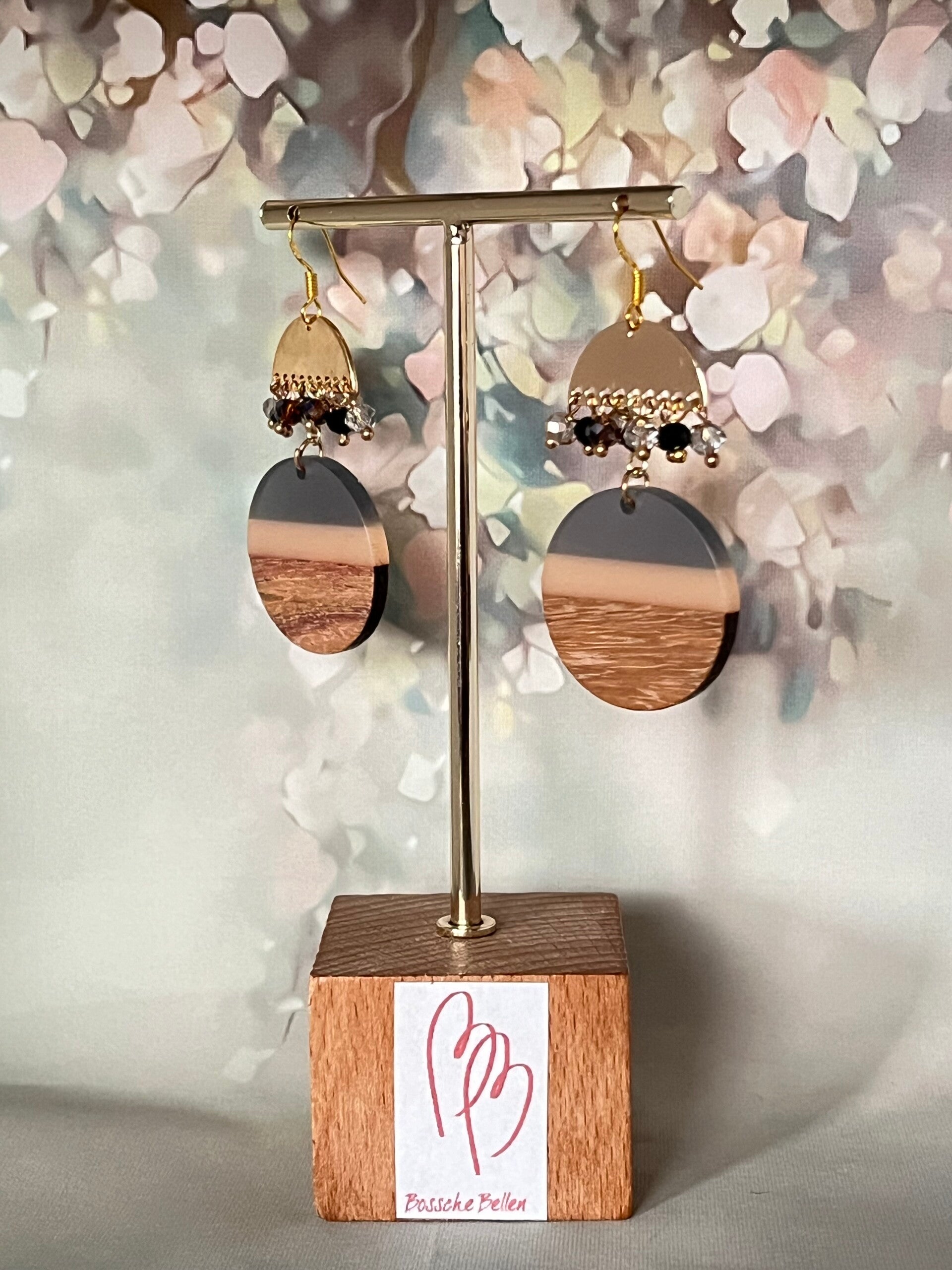 Vergulde halve maan met kristallen kraaltjes met daaronder een schijf van hout en acryl in bruin en grijs tinten