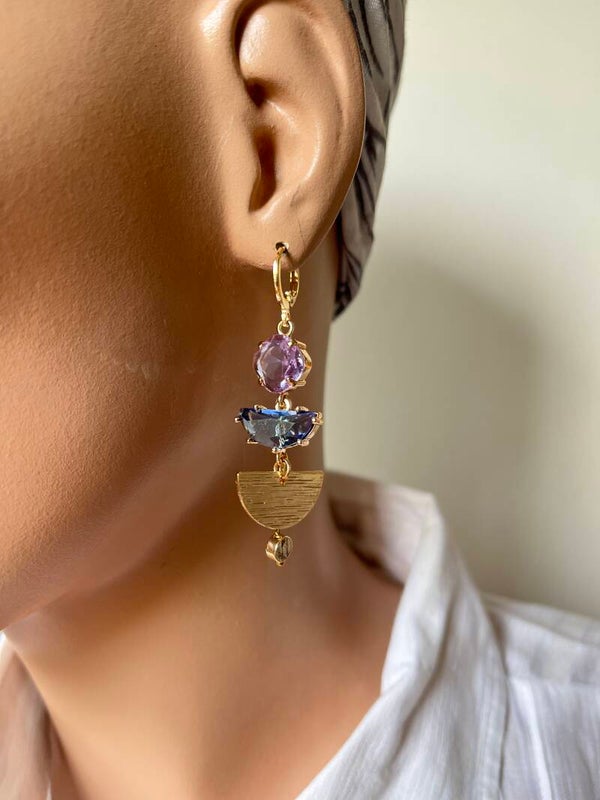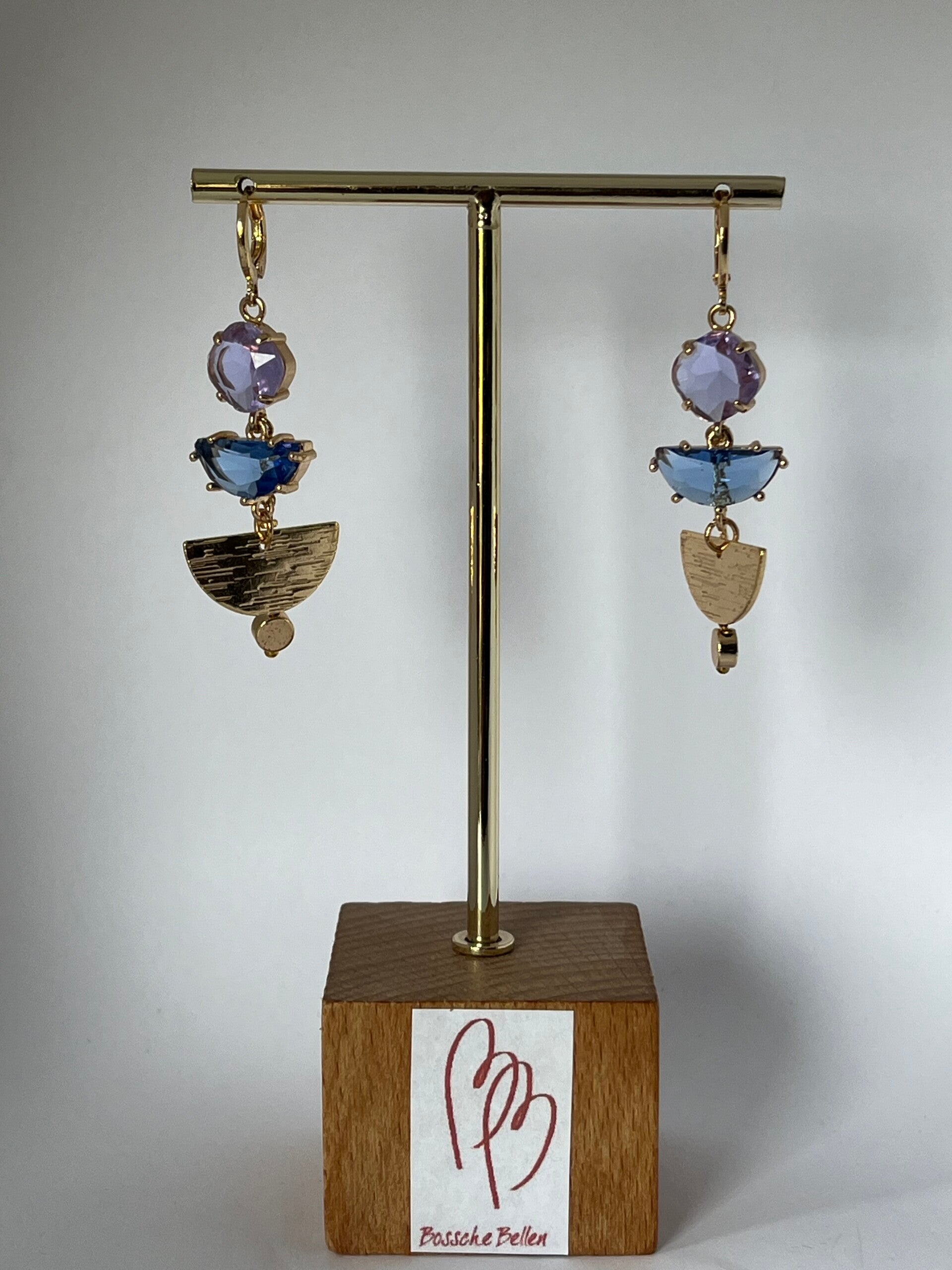 Vergulde creool met een ronde paarse bedel, een blauwe halve maan van kristalglas en een goudkleurige halve maan. Subtiel is het vergulde kettinkje met een vergulde ronde kraal.