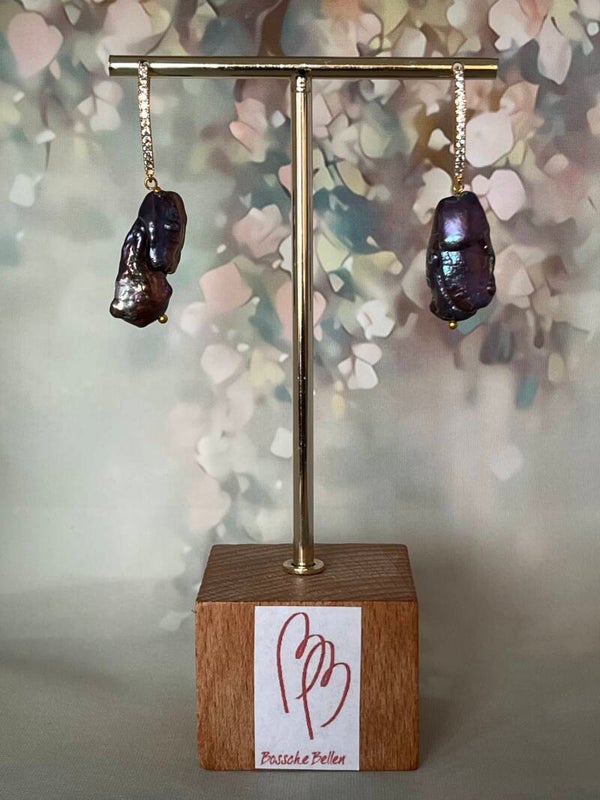 Vergulde oorzaak ingelegd met zirconia's en paarse langwerpige barokke zoetwaterparel
