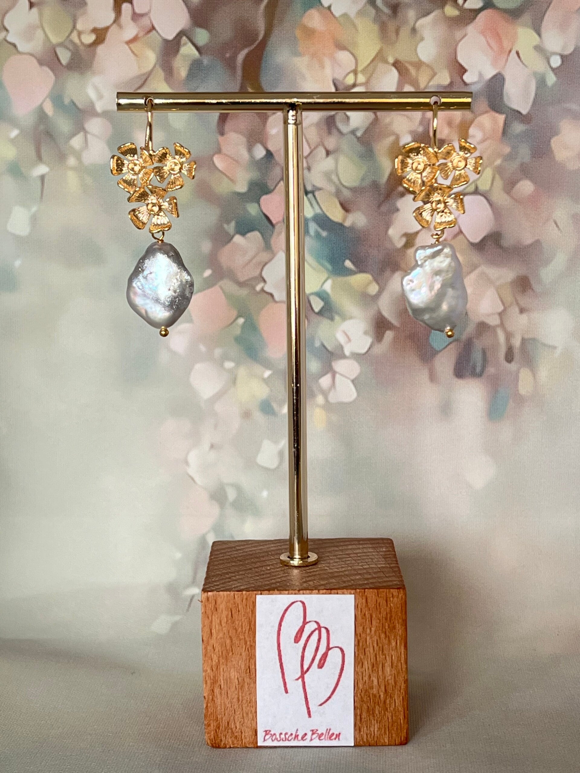 Vergulde bloem-oorhaak met grijze barokke zoetwaterparel