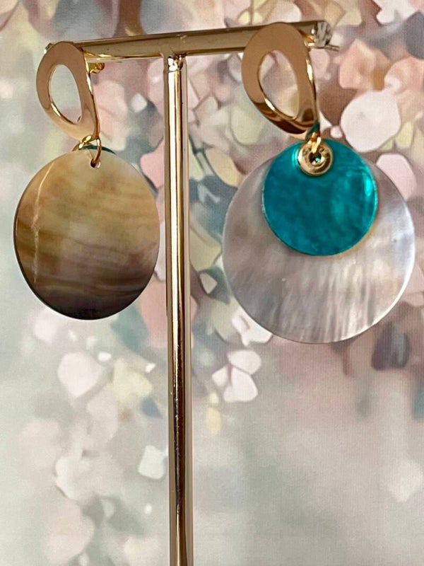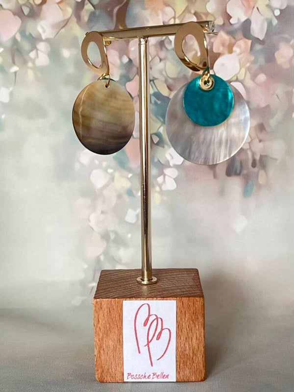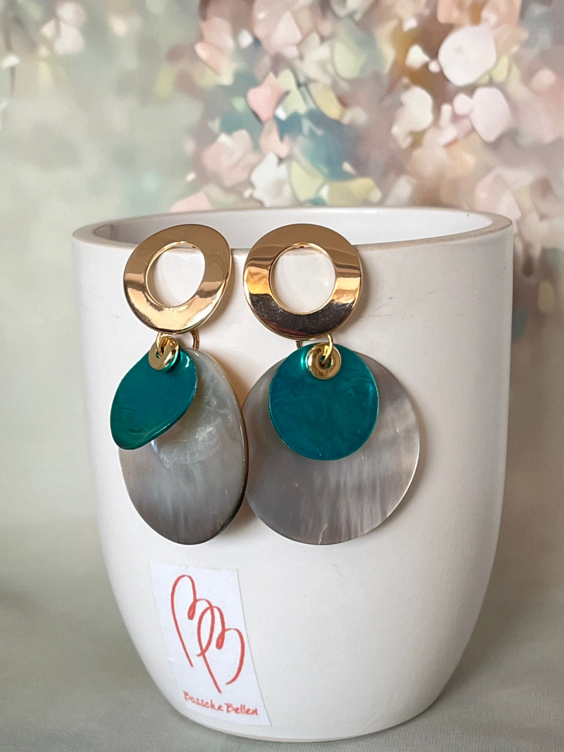 Vergulde ronde oorsteker met ronde parelmoer schelp en ronde veridiaangroene schelp met rond goudkleurig accent