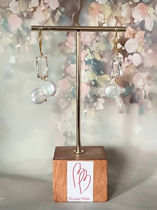 Vergulde oorhaak met rechthoekige transparant witte kristalglazen bedel met eronder witte onregelmatige zoetwaterparels