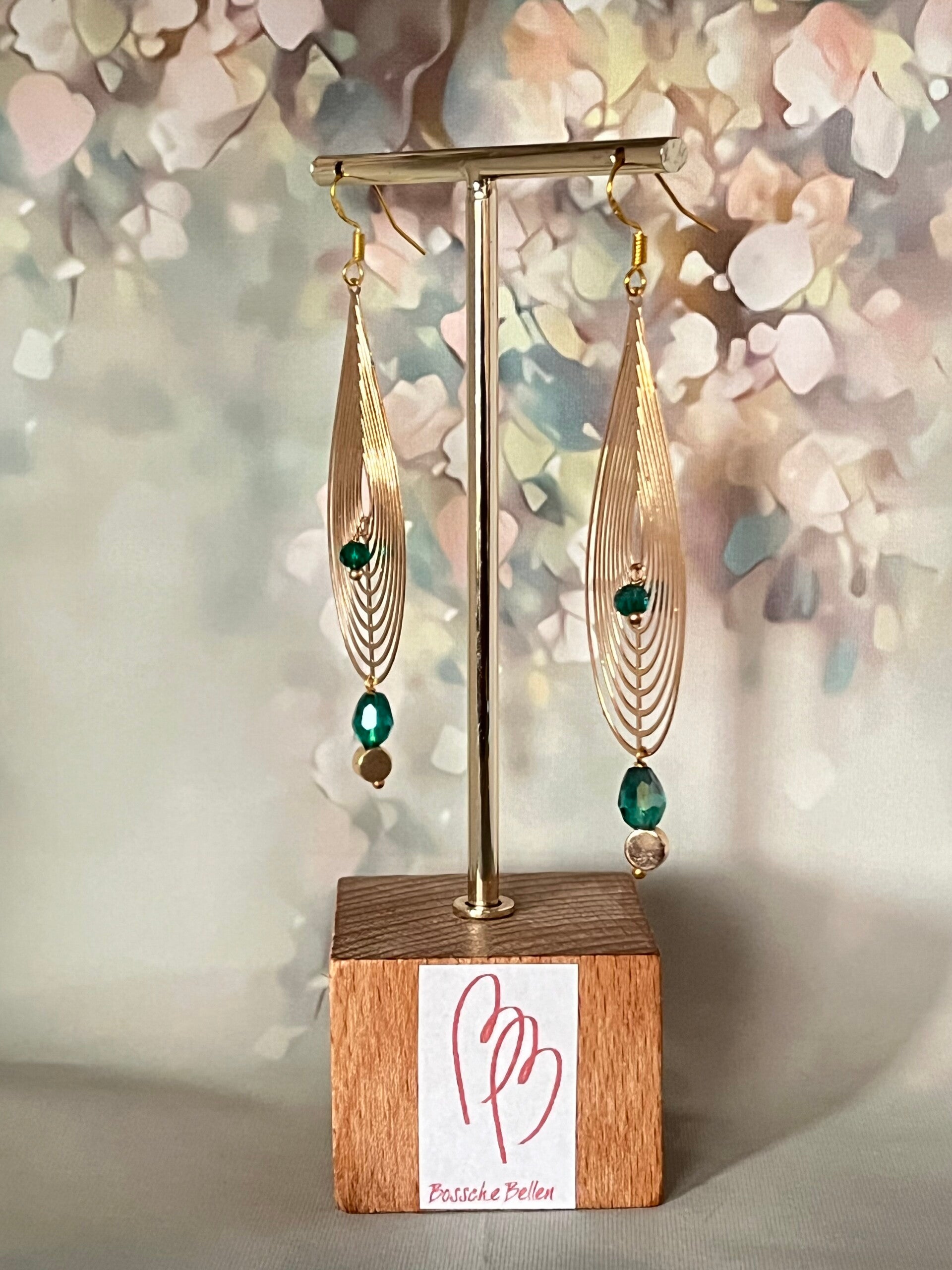Vergulde oorhaken met goudkleurig filigraan ovaal met donkergroen kristalglas