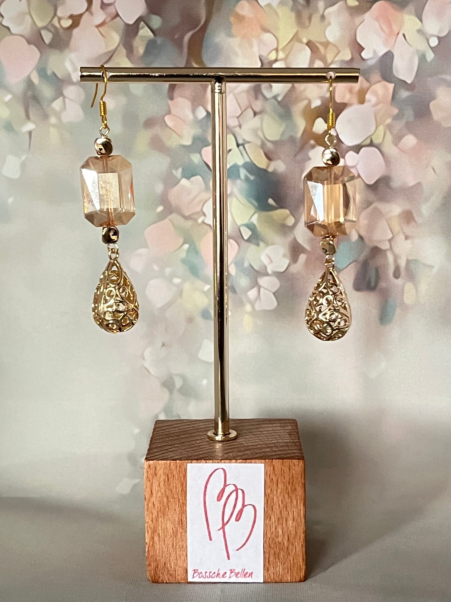 Vergulde oorhaken met rechthoek van champagnekleurig kristalglas en een vergulde opengewerkte druppel