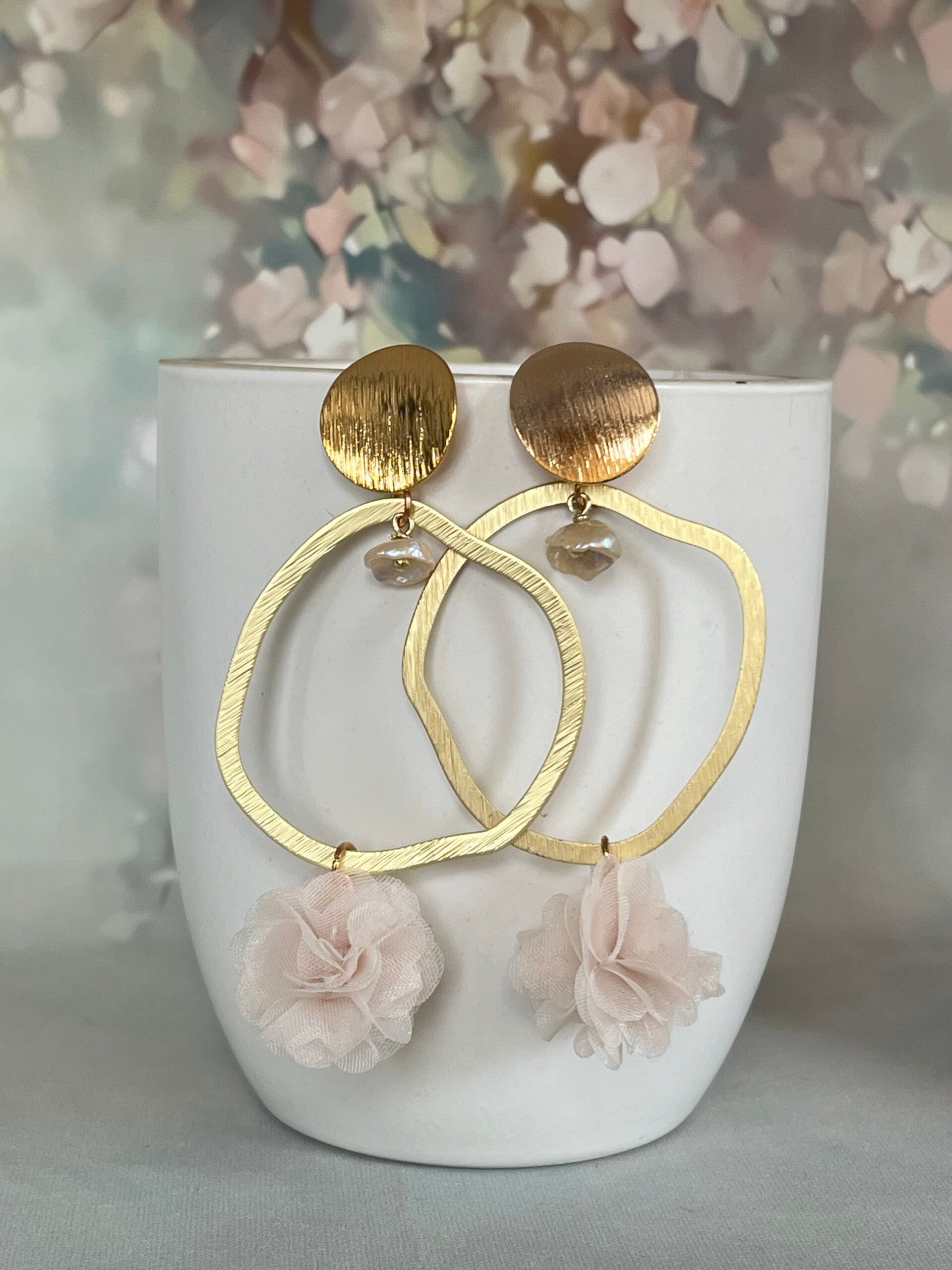 Vergulde ronde oorstekers met onregelmatige vergulde creolen, een zoetwaterpareltje en een bloemetje van crèmekleurige organzaBoven € 40,- gratis verzending
