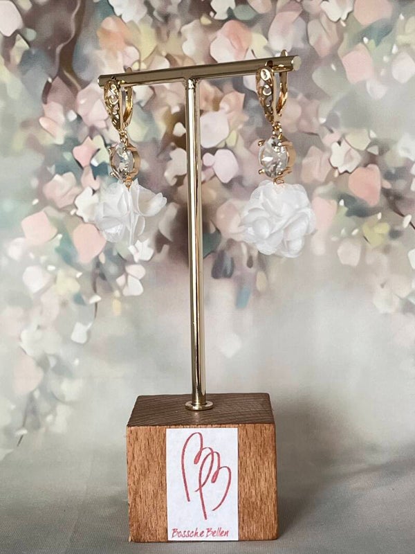 Vergulde opengewerkte oorstekers met wit kristalglas en een witte organza bloem