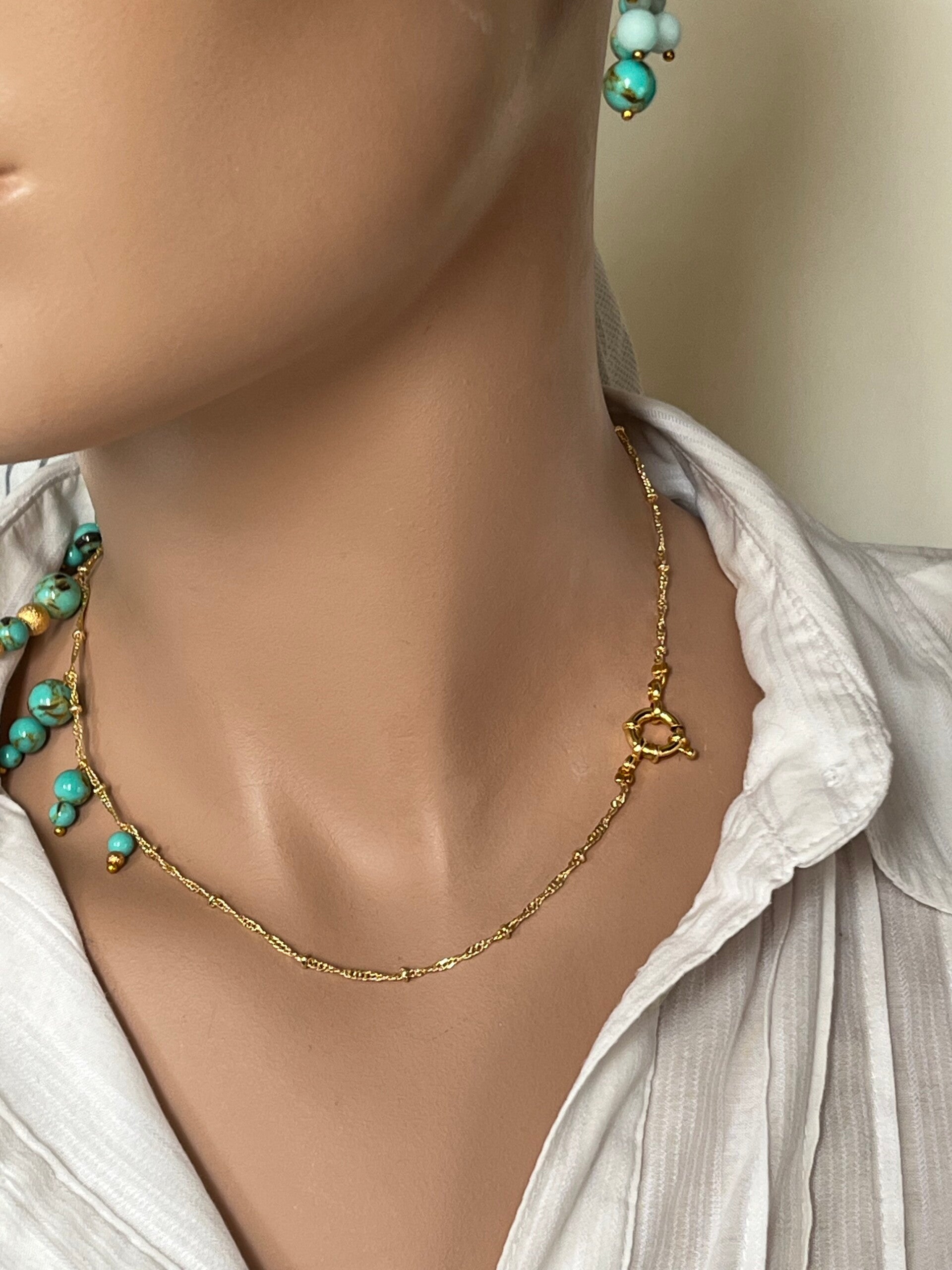 Set van vergulde creolen en vergulde ketting met trosjes van groene jaspis en vergulde balletjes en een verguld slot