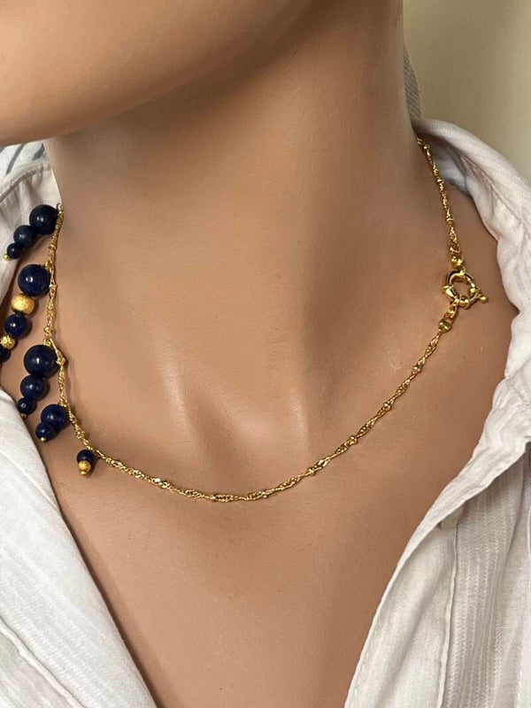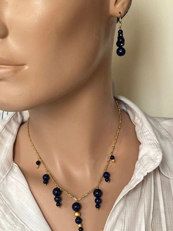 Set van vergulde creolen en vergulde ketting met trosjes van donkerblauwe Lapis Lazuli en vergulde balletjes en een verguld slot