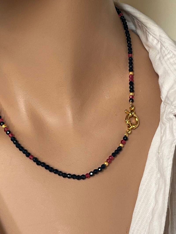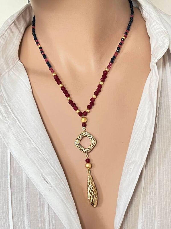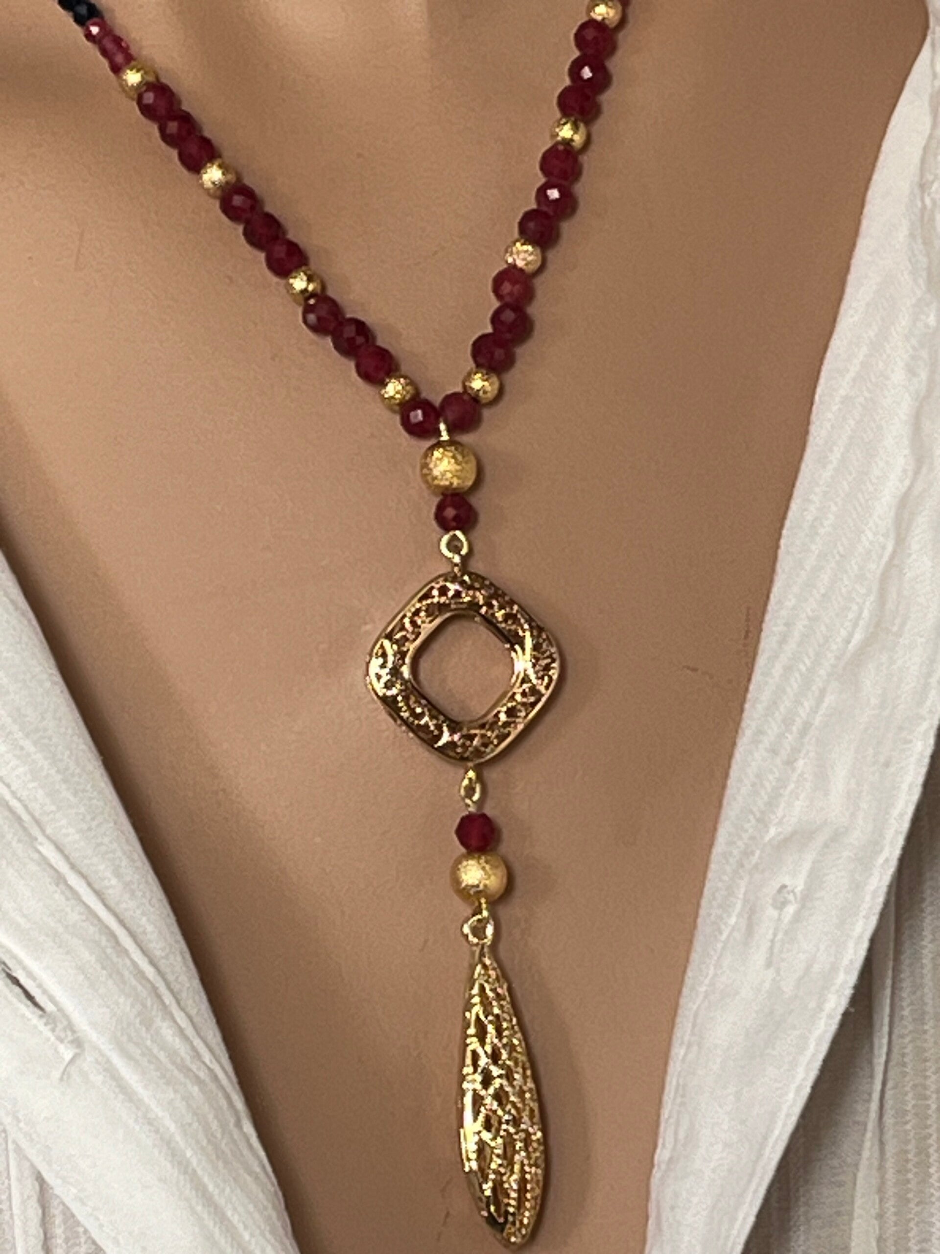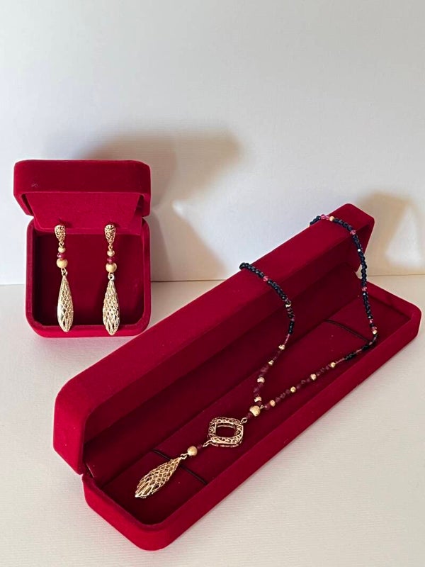 Set van een ketting met vergulde elementen en rood en donkerblauw kristalglas met verguld slot. Daarbij oorbellen van vergulde oorhaken met vergulde druppel en rood kristalglazen kraaltje