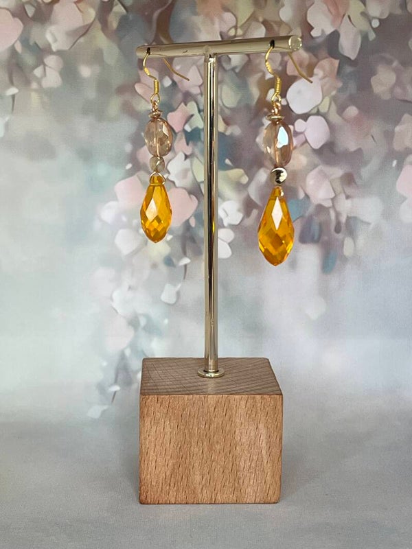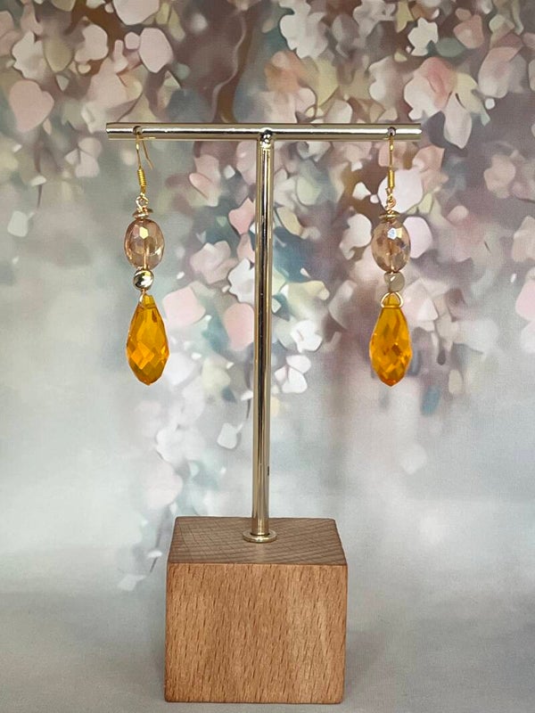 Vergulde oorhaken met oranje-gelige Oostenrijks kristalglazen briolette druppel, vergulde kraal en een champagnekleurige Oostenrijks kristalglazen ovalen kraal.