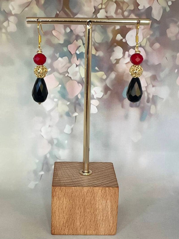 Vergulde oorhaken met zwarte Oostenrijks kristalglazen briolette kraal, vergulde opengewerkte bol en een gefacetteerde Oostenrijks kristalglazen donkerrode kraal.