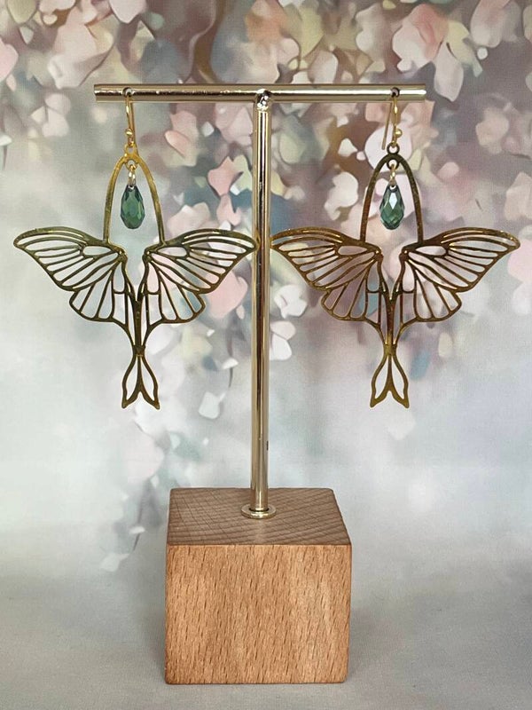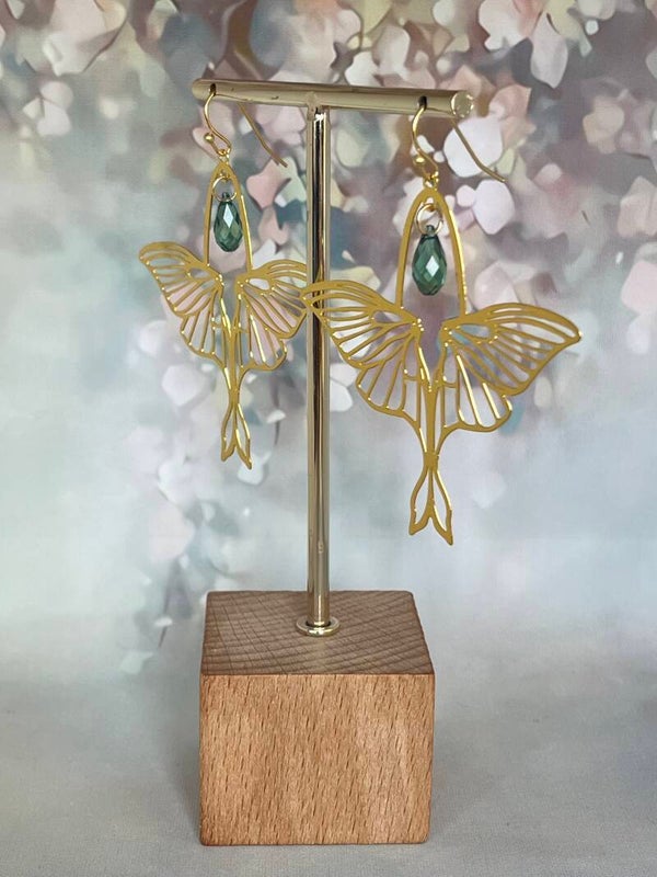 Vergulde filigraan vlinder met briolette van groen Oostenrijks kristalglas.