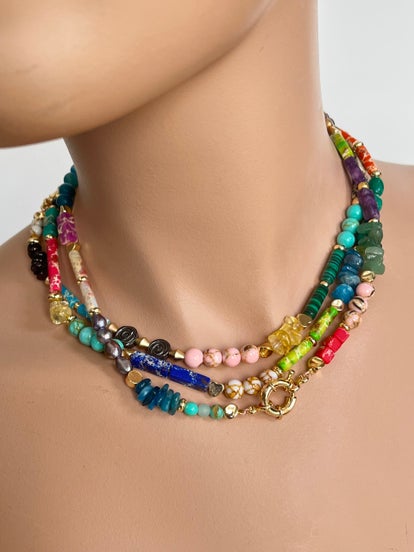 Collier gemaakt van verschillende soorten half-edelstenen, parels, lampwork en vergulde kralen.