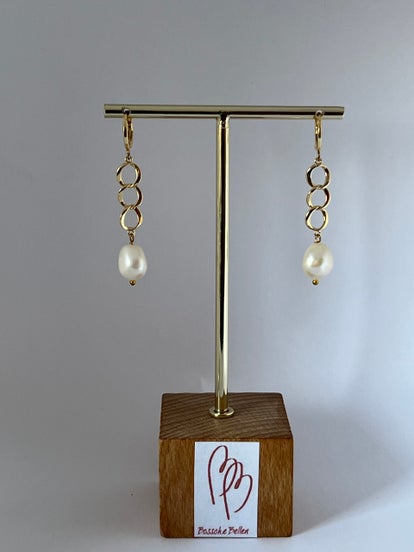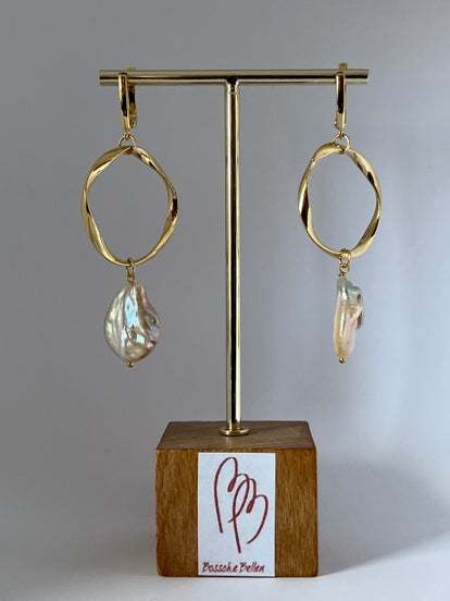 Vergulde oorsteker met daaronder grote vergulde onregelmatige ringen met platte en ronde witte zoetwaterparel
