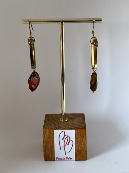 Oorhanger met goudkleurige ovaal met twee bruinkleurige zoetwaterparels