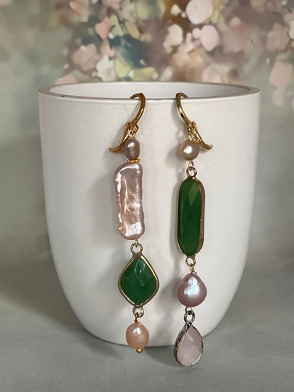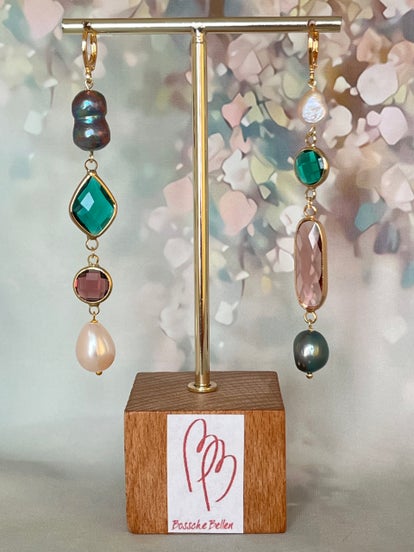 A-symmetrische oorbellen met vergulde creolen met grijze en roze zoetwaterparels en kristal in groen-roze tinten, met gouden accenten