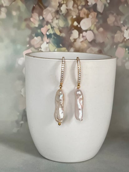 Vergulde oorhaak ingelegd met zirkonia's en roze langwerpige barokke zoetwaterparel