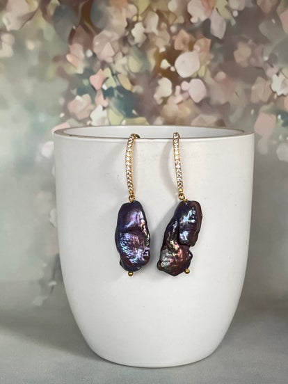 Vergulde oorzaak ingelegd met zirconia's en paarse langwerpige barokke zoetwaterparel