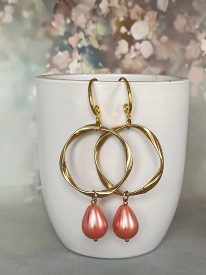Vergulde oorstekers met daaronder grote vergulde onregelmatige ringen met roze barok zoetwaterparel