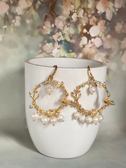 Vergulde creolen met witte zoetwaterparels en een trosjes van witte bloemetjes en gouden elementen