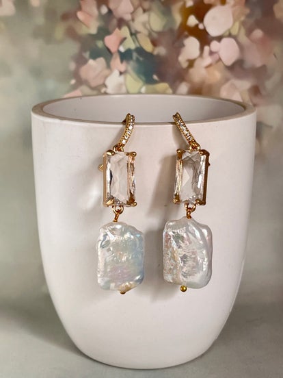 Vergulde creolen met zirconia en een rechthoek van wit kristalglas en een witte rechthoekige zoetwaterparel