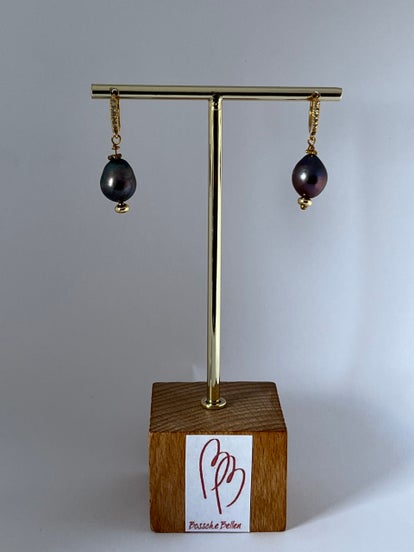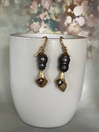 Vergulde bloem-oorhaak met grijze barokke zoetwaterparel