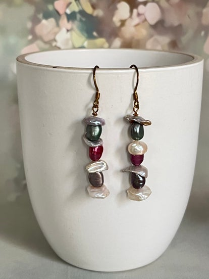 Mooie gekrulde oorhangers met zoetwaterparels in twee kleuren, afgewerkt met gouden accenten
