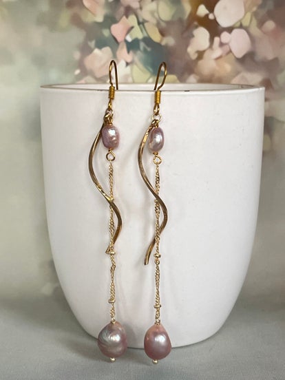 Mooie gekrulde oorhangers met zoetwaterparels in roze en paars/grijs, afgewerkt met gouden accenten