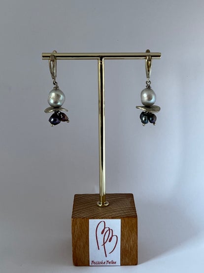 Sterling zilveren oorsteker met verzilverde spacer, grote lichtgrijze zoetwaterparel en kleine donkergrijze zoetwaterpareltjes